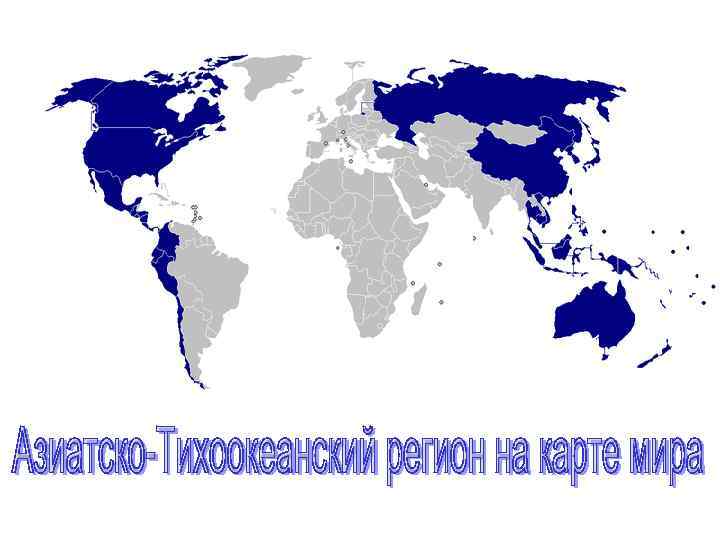 n Азиатско-Тихоокеанский регион политический и экономический термин, обозначающий страны, расположенные по периметру Тихого океана и многочисленные островные государства в самом океане. n Крупнейшими городами региона являются Шанхай, Гонконг, Сингапур, Куала-Лумпур, Сеул, Токио, Лос-Анджелес, Сидней, Мельбурн, Сан-Франциско, Сиэтл и Ванкувер. n Штаб-квартиры многих межгосударственных и негосударственных организаций Азиатско. Тихоокеанского региона расположены в Гонолулу (Гавайи).