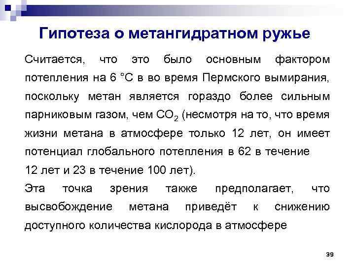 Гипотеза о метангидратном ружье Считается, что это было основным фактором потепления на 6 °C в во время Пермского вымирания, поскольку метан является гораздо более сильным парниковым газом, чем CO 2 (несмотря на то, что время жизни метана в атмосфере только 12 лет, он имеет потенциал глобального потепления в 62 в течение 12 лет и 23 в течение 100 лет). Эта точка зрения высвобождение также метана предполагает, приведёт к что снижению доступного количества кислорода в атмосфере 39