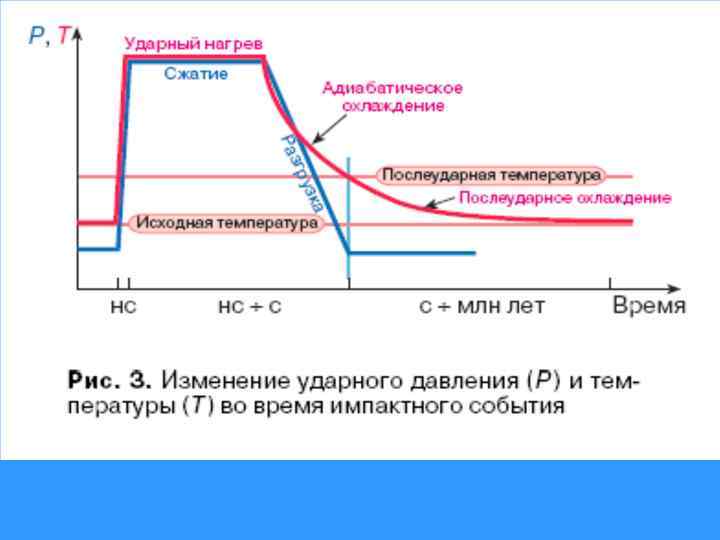 Схема расположения зон превращения вещества под действием ударной волны (Вальтер, 1977). Порождаемая высокоскоростным ударом и взрывом ударная волна распространяется в целом радиально от точки соударения и, постепенно затухая, производит работу по нагреву, деформации, разрушению горных пород и экскавации самой впадины кратера