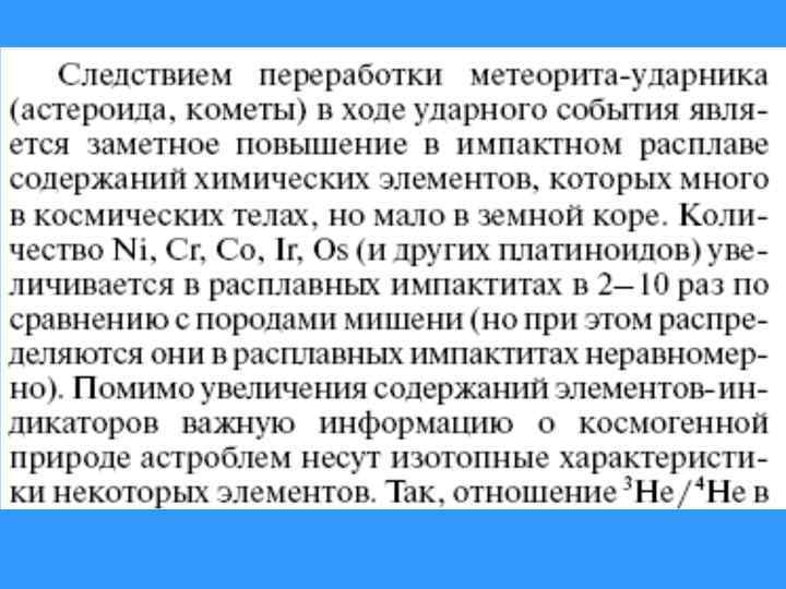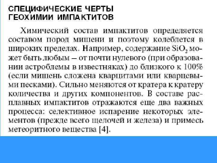 • Особенность геохимии импактитов – такие элементы, как Sn, F, B, P при импактном процессе не испаряются по причине высокой фугитивности кислорода (даже выше, чем в атмосфере). • При импактном метаморфизме на геохимию пород значительное влияние оказывают процессы испарения.