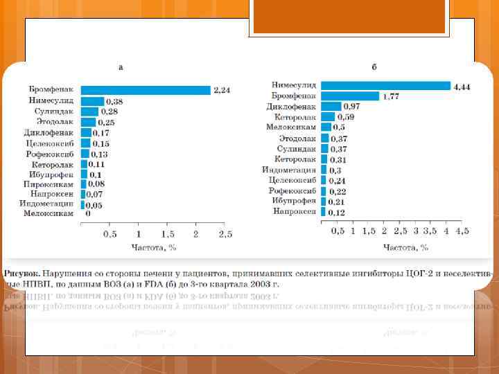 Диклофенак Многоцентровое исследование CLASS (Celecoxib Long-term Arthritis Safety Study) Более 8000 пациентов с остеоартритами и РА Результат: частота НЛР со стороны печени при терапии диклофенаком оказались в 4, 7 -5, 3 раза выше, чем при терапии целекоксибом или ибупрофеном.