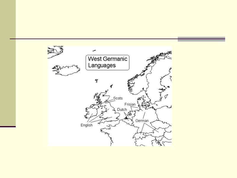 West Germanic dwelt in the lowlands between the Oder and the Elbe spoke Old High German (8th c.) Old English (7th c.) Old Saxon (9th c.) Old Dutch (12th c.)