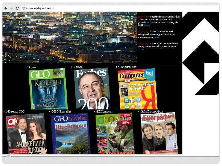«АКСЕЛЬ ШПРИНГЕР АГ» (НЕМ. AXEL SPRINGER AG) • Один из крупнейших европейских издательских и медиаконцернов, выпускающий свыше 150 наименований газет и журналов в более чем 32 странах, включая Германию, Францию, Испанию, Россию, Швейцарию, Венгрию, Польшу, Чехию и др. Общее число работников в компании превышает 10000 человек, а годовой доход составляет более 2 млрд €. • Наиболее известные издания в Германии — • «Die Welt» , «Bild» , «Auto Bild» , «Computer. Bild» , «Maxim» , «YAM!» и мн. др.