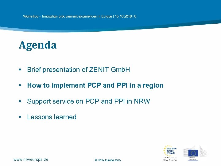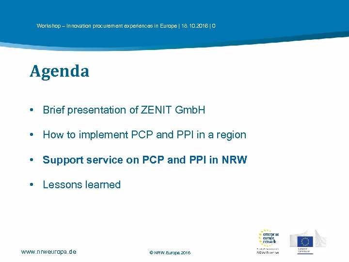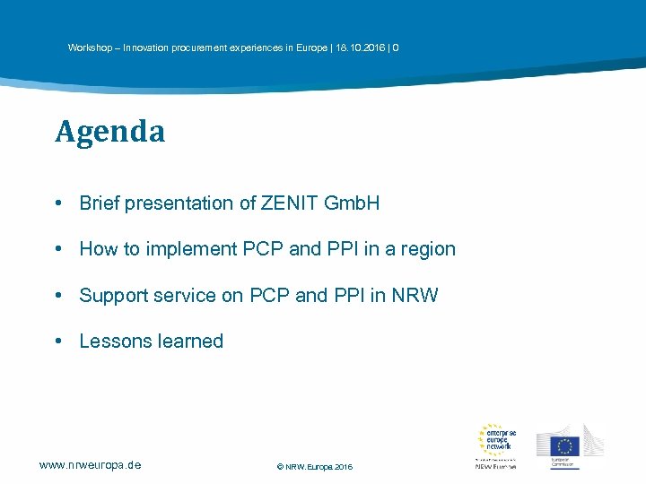 Workshop – Innovation procurement experiences in Europe | 18. 10. 2016 | 0 Agenda • Brief presentation of ZENIT Gmb. H • How to implement PCP and PPI in a region • Support service on PCP and PPI in NRW • Lessons learned www. nrweuropa. de © NRW. Europa 2016
