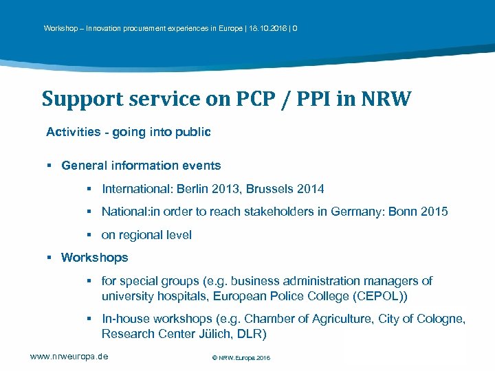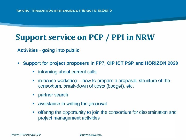 Workshop – Innovation procurement experiences in Europe | 18. 10. 2016 | 0 Support service on PCP / PPI in NRW Activities - going into public § Support for project proposers in FP 7, CIP ICT PSP and HORIZON 2020 § informing about current calls § in-house workshop – how to prepare a proposal, structure of the consortium, break-down of costs (budget), etc. § partner search § assistance in writing the proposal § offering the opportunity to join the consortium for dissemination and project management activities www. nrweuropa. de © NRW. Europa 2016