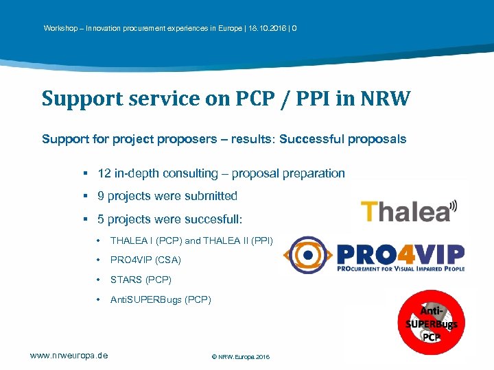 Workshop – Innovation procurement experiences in Europe | 18. 10. 2016 | 0 Support service on PCP / PPI in NRW Support for project proposers – results: Successful proposals § 12 in-depth consulting – proposal preparation § 9 projects were submitted § 5 projects were succesfull: • THALEA I (PCP) and THALEA II (PPI) • PRO 4 VIP (CSA) • STARS (PCP) • Anti. SUPERBugs (PCP) www. nrweuropa. de © NRW. Europa 2016
