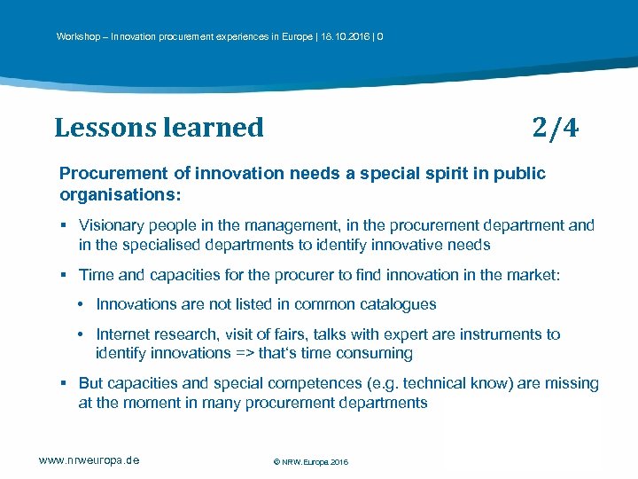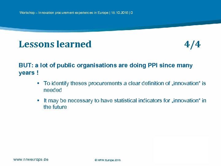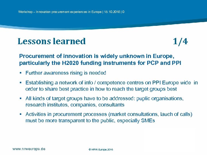 Workshop – Innovation procurement experiences in Europe | 18. 10. 2016 | 0 Lessons learned 1/4 Procurement of innovation is widely unknown in Europe, particularly the H 2020 funding instruments for PCP and PPI § Further awareness rising is needed § Establishing a network of info / competence centres on PPI Europe wide in order to share best practice in how to reach the target groups best § All kinds of target groups have to be addressed: puplic organisations, research institutes, companies, consultants § Activities in procurement processes (market consultations, lauch of calls) must be more transparent to the public, especially SMEs www. nrweuropa. de © NRW. Europa 2016