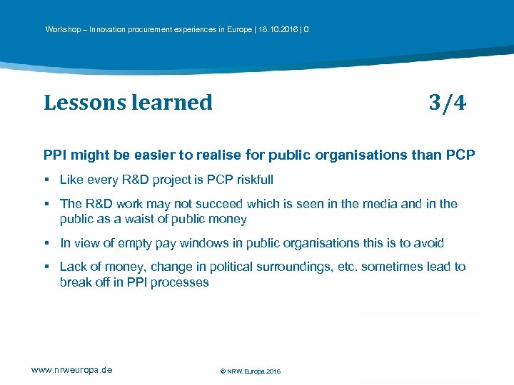 Workshop – Innovation procurement experiences in Europe | 18. 10. 2016 | 0 Lessons learned 3/4 PPI might be easier to realise for public organisations than PCP § Like every R&D project is PCP riskfull § The R&D work may not succeed which is seen in the media and in the public as a waist of public money § In view of empty pay windows in public organisations this is to avoid § Lack of money, change in political surroundings, etc. sometimes lead to break off in PPI processes www. nrweuropa. de © NRW. Europa 2016