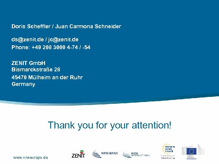 Doris Scheffler / Juan Carmona Schneider ds@zenit. de / jc@zenit. de Phone: +49 208 3000 4 -74 / -54 ZENIT Gmb. H Bismarckstraße 28 45470 Mülheim an der Ruhr Germany Thank you for your attention! www. nrweuropa. de