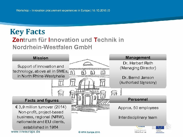 Workshop – Innovation procurement experiences in Europe | 18. 10. 2016 | 0 Key Facts Zentrum für Innovation und Technik in Nordrhein-Westfalen Gmb. H Management Dr. Herbert Rath (Managing Director) Mission Support of innovation and technology, above all in SMEs, in North Rhine-Westphalia Dr. Bernd Janson (Authorized Signatory) Facts and figures Personnel € 3, 9 million turnover (2014) Non-profit, project-based business, regional (NRW), nationwide and EU clients, established in 1984 Approx. 50 employees www. nrweuropa. de Interdisciplinary team © NRW. Europa 2016
