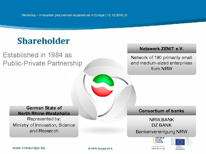 Workshop – Innovation procurement experiences in Europe | 18. 10. 2016 | 0 Shareholder Netzwerk ZENIT e. V. Established in 1984 as Public-Private Partnership Network of 190 primarily small and medium-sized enterprises from NRW German State of North Rhine-Westphalia Represented by: Ministry of Innovation, Science and Research www. nrweuropa. de Consortium of banks NRW. BANK DZ BANK Bankenvereinigung NRW © NRW. Europa 2016