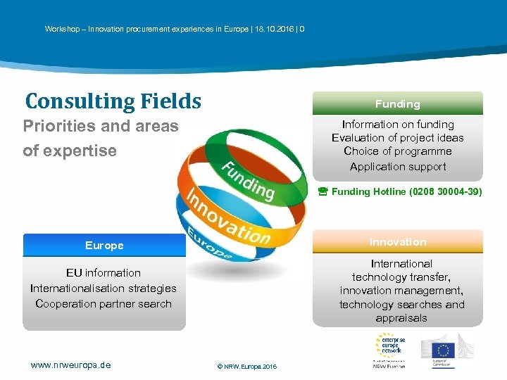Workshop – Innovation procurement experiences in Europe | 18. 10. 2016 | 0 Consulting Fields Funding Priorities and areas of expertise Information on funding Evaluation of project ideas Choice of programme Application support Funding Hotline (0208 30004 -39) Innovation Europe International technology transfer, innovation management, technology searches and appraisals EU information Internationalisation strategies Cooperation partner search www. nrweuropa. de © NRW. Europa 2016