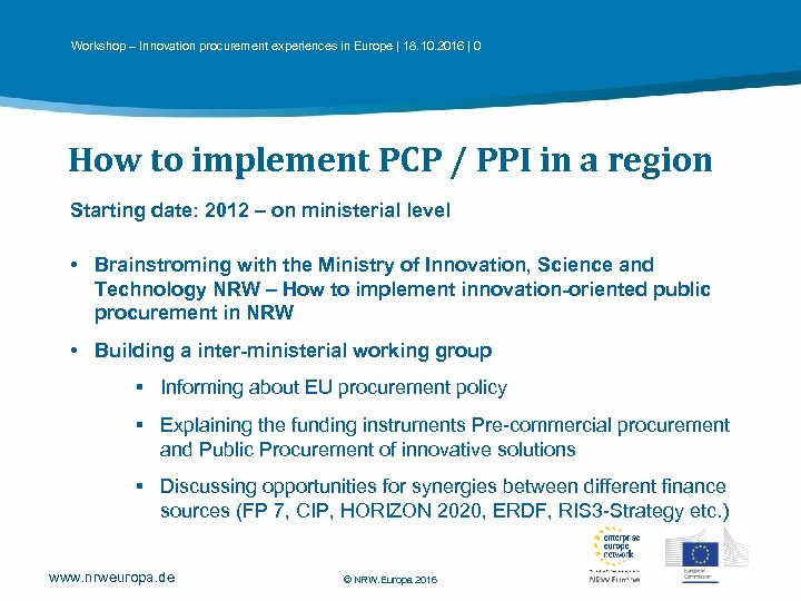 Workshop – Innovation procurement experiences in Europe | 18. 10. 2016 | 0 How to implement PCP / PPI in a region Starting date: 2012 – on ministerial level • Brainstroming with the Ministry of Innovation, Science and Technology NRW – How to implement innovation-oriented public procurement in NRW • Building a inter-ministerial working group § Informing about EU procurement policy § Explaining the funding instruments Pre-commercial procurement and Public Procurement of innovative solutions § Discussing opportunities for synergies between different finance sources (FP 7, CIP, HORIZON 2020, ERDF, RIS 3 -Strategy etc. ) www. nrweuropa. de © NRW. Europa 2016