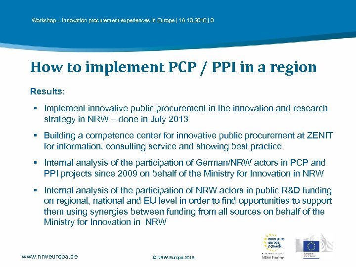 Workshop – Innovation procurement experiences in Europe | 18. 10. 2016 | 0 How to implement PCP / PPI in a region Results: § Implement innovative public procurement in the innovation and research strategy in NRW – done in July 2013 § Building a competence center for innovative public procurement at ZENIT for information, consulting service and showing best practice § Internal analysis of the participation of German/NRW actors in PCP and PPI projects since 2009 on behalf of the Ministry for Innovation in NRW § Internal analysis of the participation of NRW actors in public R&D funding on regional, national and EU level in order to find opportunities to support them using synergies between funding from all sources on behalf of the Ministry for Innovation in NRW www. nrweuropa. de © NRW. Europa 2016