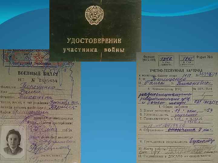 Моя прабабушка Терещенко (Ильина) Раиса Тихоновна (19. 10. 1923 -2. 01. 2015) - была участницей Великой Отечественной войны. Это удивительно сильный человек, которым я восхищаюсь. Она родилась в многодетной семье, 6 девочек и 1 мальчик. Прабабушка была самой старшей. Изначально ее родители жили в Оренбурге, отец - Тихон был очень богатым человеком, а мать - Ольга из бедной семьи, но со временем отца раскулачили, и они были вынуждены ехать в Туркестан. Именно по этой причине Раиса Тихоновна родилась в Туркестане.