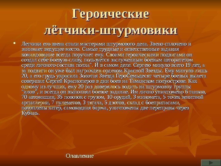 Героические лётчики-штурмовики Летчики его звена стали мастерами штурмового дела. Звено сплочено и занимает ведущее место. Самые трудные и ответственные задания командование всегда поручает ему. Своими героическими подвигами он создал себе боевую славу, пользуется заслуженным боевым авторитетом среди личного состава полка». И в самом деле. Сергею минуло всего 19 лет, а за подвиги он уже был награжден орденом Красной Звезды. Ему минуло лишь 20, а его грудь украсила Золотая Звезда Геро. Семьдесят четыре боевых вылета совершил Сергей Красноперов в дни боев на Таманском полуострове. Как одному из лучших, ему 20 раз доверялось водить на штурмовку группы «илов», и всегда он выполнял боевое задание. Им лично уничтожено 6 танков, 70 автомашин, 35 повозок с грузом, 10 орудий, 3 миномета, 5 точек зенитной артиллерии, 7 пулеметов, 3 тягача, 5 дзотов, склад с боеприпасами, потоплены катер, самоходная баржа, уничтожены две переправы через Кубань. Олавление