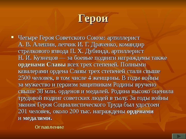 Герои Четыре Героя Советского Союза: артиллерист А. В. Алешин, летчик И. Г. Драченко, командир стрелкового взвода П. Х. Дубинда, артиллерист Н. И. Кузнецов — за боевые подвиги награждены также орденами Славы всех трех степеней. Полными кавалерами ордена Славы трех степеней стали свыше 2500 человек, в том числе 4 женщины. В годы войны за мужество и героизм защитникам Родины вручено свыше 38 млн. орденов и медалей. Родина высоко оценила трудовой подвиг советских людей в тылу. За годы войны звания Героя Социалистического Труда был удостоен 201 человек, около 200 тыс. награждены орденами и и медалями. Оглавление