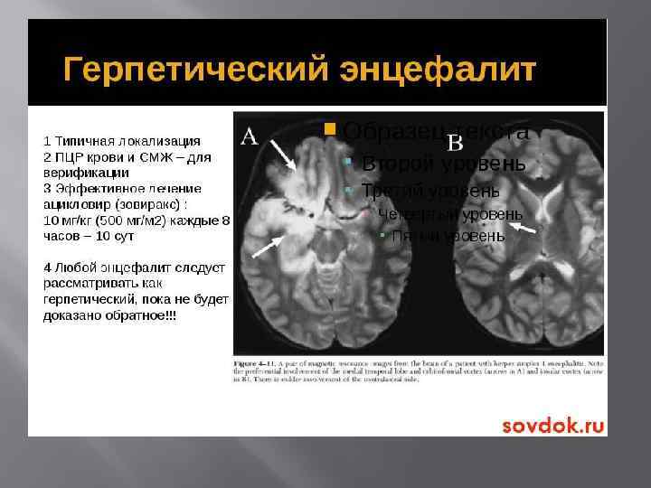 Клиническая картина Характерно острое начало заболевания с лихорадкой, головной болью, общей слабостью. Позже развивается очаговая неврологическая симптоматика в зависимости от области поражения головного мозга. Появляются судороги по джексоновскому типу, обонятельные/вкусовые галлюцинации, изменяется сознание после респираторной инфекции. В 20– 40% случаев встречаются герпетические высыпания.