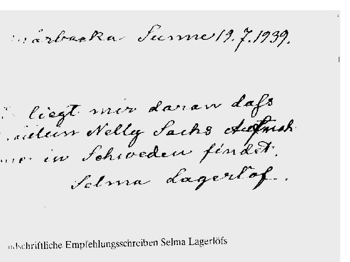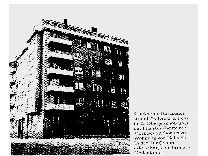 Im Exil „Wenn man selbst einmal auf einer Flucht einen Stein gestreichelt hat, weil es das erste war, worauf man sich niederließ in einem freien Land – so hat man niemals mehr ein nahes Verhältnis zu allem, was nicht ganz direkt zum Dasein dient. „ -> Sachs’ Einstellung zu ihrem Leben im Exil. - sie bleibt in dem folgenden Haus in Stockholm bis zu ihrem Tod, dort ensteht ihr ganzes dichterisches Werk: