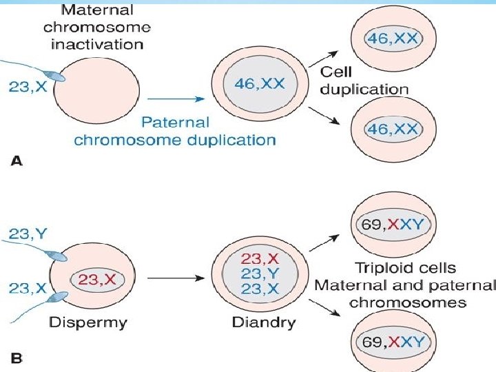 Pathogenesis Abnormal fertilization process Normal ovum with a duplicated haploid sperm Inactive ovum chromosomes Karyotype 46, XX diploid and result from androgenesis Partial moles triploid karyotype 69, XXX, 69, XXY