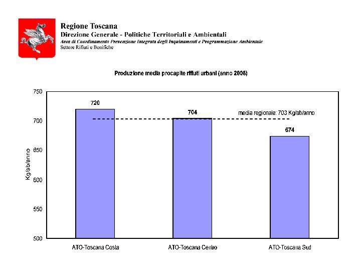 La produzione di rifiuti urbani e assimilati • La produzione di rifiuti urbani e assimilati in Toscana, secondo i recenti dati di ARRR, nel 2006 è stata pari a 2. 562. 374 tonnellate (corrispondente in media a 703 Kg/abitante/anno) • I recenti dati di ARRR indicano un aumento della produzione totale procapite nel 2006 rispetto al 2005 dell’ 1, 1% • La raccolta differenziata certificata per il 2006 è stata pari al 33, 42%, in lieve incremento rispetto all’anno precedente. Secondo i dati APAT la Regione Toscana è la quinta in Italia per raccolta differenziata.