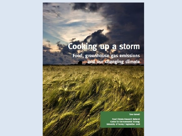 What might a low GHG diet look like? • Not overeating (but. . . ) • Much less meat and dairy • Seasonal indigenous field-grown foods – (not always possible) • • • Not eating certain foods (but. . . ) Reducing dependence on cold chain (but. . . ) Wasting less (systemic issues. . . ) Efficient cooking Redefining quality Broadly compatible with healthy eating goals • Curbing trends as much as making changes – ie. reassess expansion of unsustainable trends e. g. air freight or refrigeration dependent supply chains; curb trends in m&d consumption