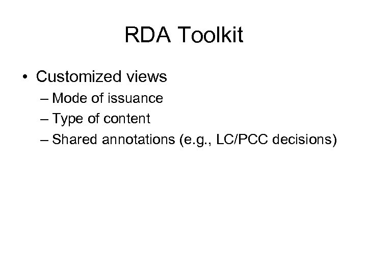 RDA Toolkit • Customized views – Mode of issuance – Type of content – Shared annotations (e. g. , LC/PCC decisions)