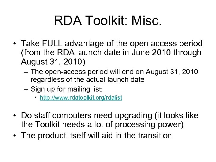 RDA Toolkit: Misc. • Take FULL advantage of the open access period (from the RDA launch date in June 2010 through August 31, 2010) – The open-access period will end on August 31, 2010 regardless of the actual launch date – Sign up for mailing list: • http: //www. rdatoolkit. org/rdalist • Do staff computers need upgrading (it looks like the Toolkit needs a lot of processing power) • The product itself will aid in the transition