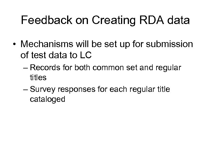 Feedback on Creating RDA data • Mechanisms will be set up for submission of test data to LC – Records for both common set and regular titles – Survey responses for each regular title cataloged