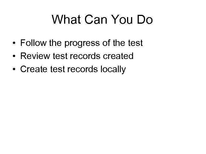 What Can You Do • Follow the progress of the test • Review test records created • Create test records locally