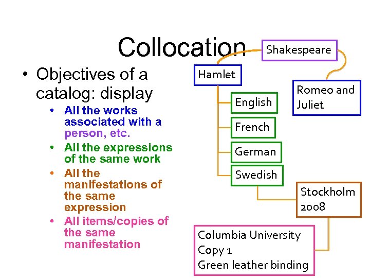 Collocation • Objectives of a catalog: display • All the works associated with a person, etc. • All the expressions of the same work • All the manifestations of the same expression • All items/copies of the same manifestation Shakespeare Hamlet English Romeo and Juliet French German Swedish Stockholm 2008 Columbia University Copy 1 Green leather binding