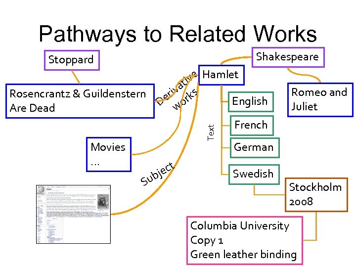 Pathways to Related Works Shakespeare Stoppard Text Rosencrantz & Guildenstern Are Dead ive Hamlet at riv rks English De wo French Movies … Su ect bj Romeo and Juliet German Swedish Stockholm 2008 Columbia University Copy 1 Green leather binding