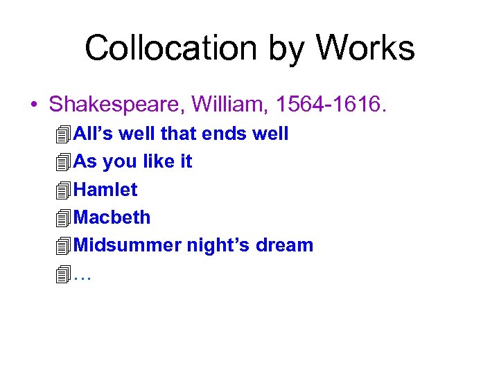 Collocation by Works • Shakespeare, William, 1564 -1616. 4 All’s well that ends well 4 As you like it 4 Hamlet 4 Macbeth 4 Midsummer night’s dream 4…