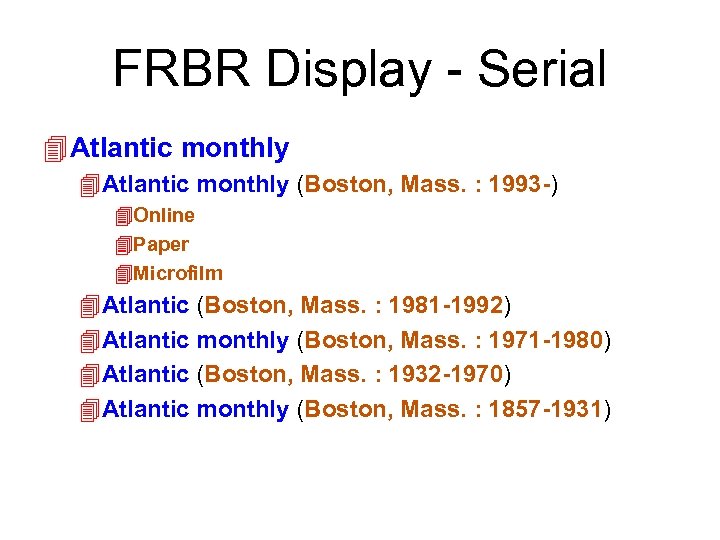 FRBR Display - Serial 4 Atlantic monthly (Boston, Mass. : 1993 -) 4 Atlantic (Boston, Mass. : 1981 -1992) 4 Atlantic monthly (Boston, Mass. : 19711980) 4 Atlantic (Boston, Mass. : 1932 -1970) 4 Atlantic monthly (Boston, Mass. : 18571931)