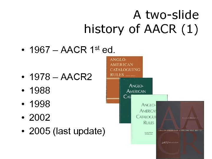 A two-slide history of AACR (1) • 1967 – AACR 1 st ed. • • • 1978 – AACR 2 1988 1998 2002 2005 (last update)