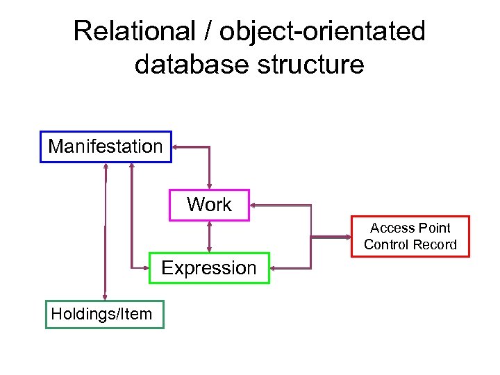Relational / object-orientated database structure Manifestation Work Access Point Control Record Expression Holdings/Item