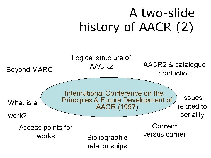 A two-slide history of AACR (2) Beyond MARC What is a work? Logical structure of AACR 2 & catalogue production International Conference on theof Principles && Future Development of Issues Future Development Principles AACR (1997) related to AACR (1997) seriality Access points for works Bibliographic relationships Content versus carrier