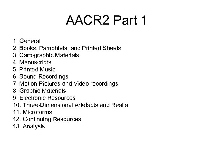 AACR 2 Part 1 1. General 2. Books, Pamphlets, and Printed Sheets 3. Cartographic Materials 4. Manuscripts 5. Printed Music 6. Sound Recordings 7. Motion Pictures and Video recordings 8. Graphic Materials 9. Electronic Resources 10. Three-Dimensional Artefacts and Realia 11. Microforms 12. Continuing Resources 13. Analysis