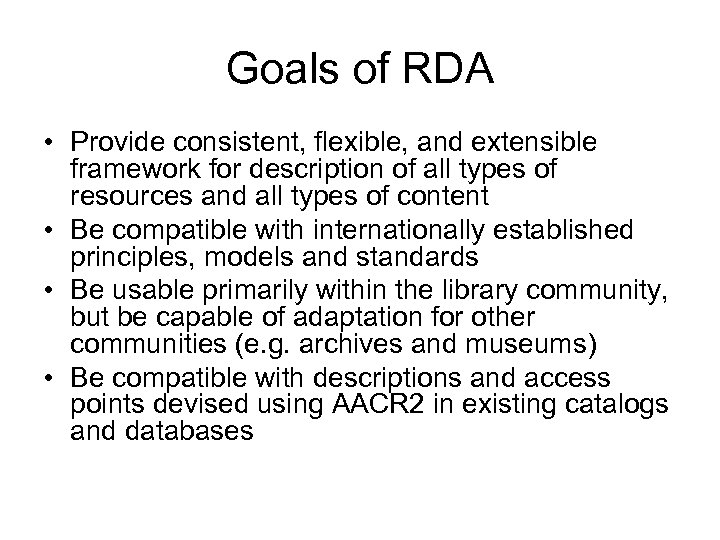 Goals of RDA • Provide consistent, flexible, and extensible framework for description of all types of resources and all types of content • Be compatible with internationally established principles, models and standards • Be usable primarily within the library community, but be capable of adaptation for other communities (e. g. archives and museums) • Be compatible with descriptions and access points devised using AACR 2 in existing catalogs and databases