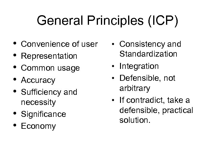 General Principles (ICP) • • Convenience of user Representation Common usage Accuracy Sufficiency and necessity Significance Economy • Consistency and Standardization • Integration • Defensible, not arbitrary • If contradict, take a defensible, practical solution.