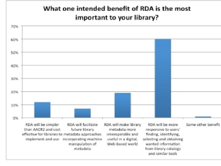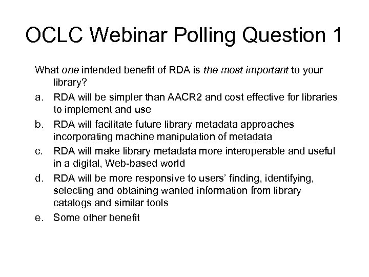 OCLC Webinar Polling Question 1 What one intended benefit of RDA is the most important to your library? a. RDA will be simpler than AACR 2 and cost effective for libraries to implement and use b. RDA will facilitate future library metadata approaches incorporating machine manipulation of metadata c. RDA will make library metadata more interoperable and useful in a digital, Web-based world d. RDA will be more responsive to users’ finding, identifying, selecting and obtaining wanted information from library catalogs and similar tools e. Some other benefit