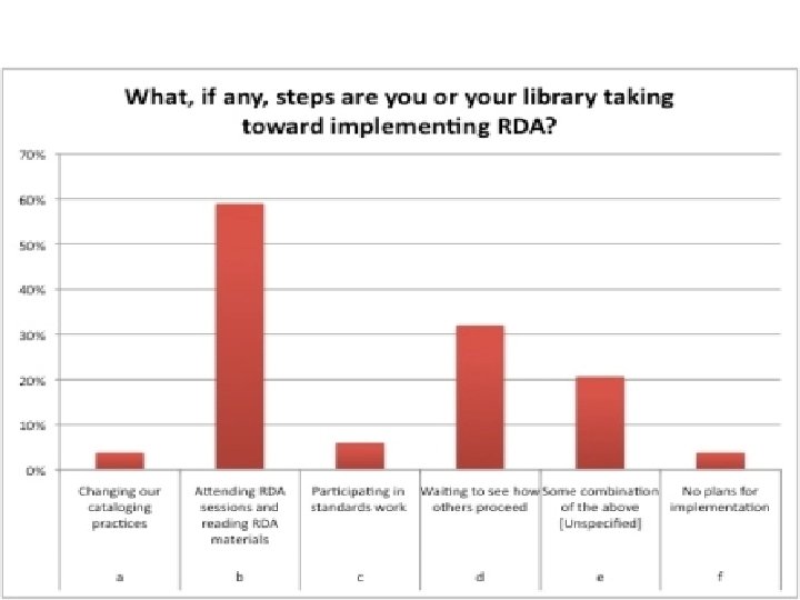 OCLC Webinar Polling Question 2 What, if any, steps are you or your library taking toward implementing RDA? a. b. c. d. e. f. Changing our cataloging practices Attending RDA sessions and reading RDA materials Participating in standards work Waiting to see how others proceed Some combination of the above No plans for implementation