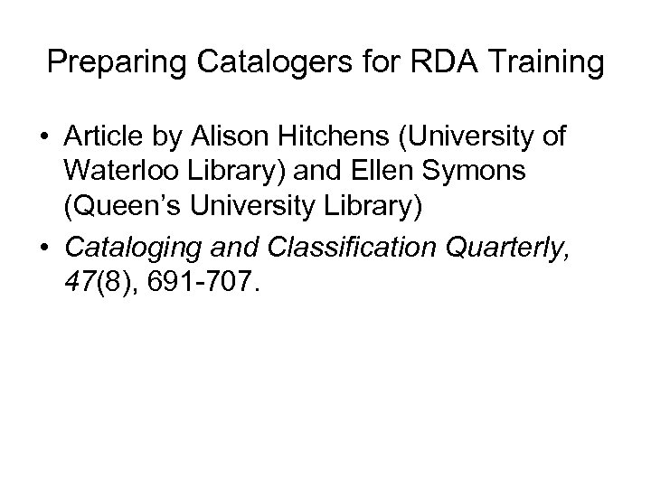 Preparing Catalogers for RDA Training • Article by Alison Hitchens (University of Waterloo Library) and Ellen Symons (Queen’s University Library) • Cataloging and Classification Quarterly, 47(8), 691 -707.