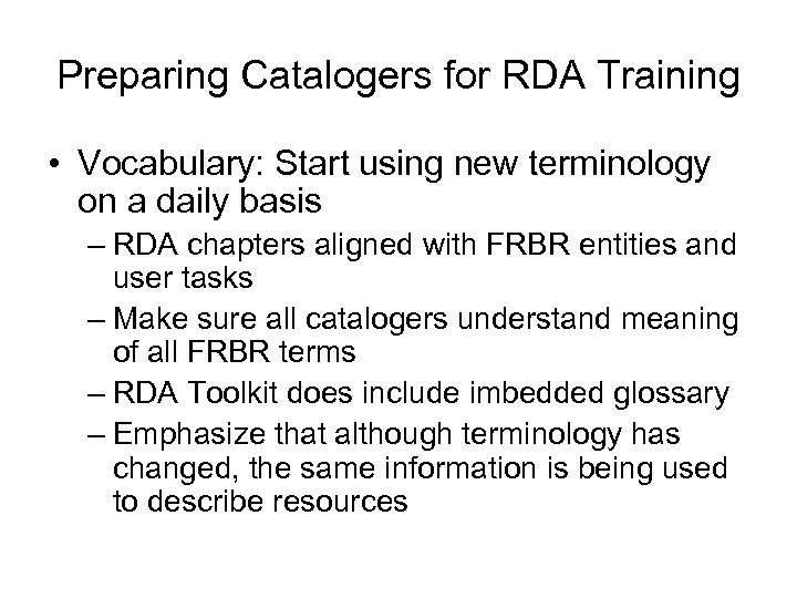 Preparing Catalogers for RDA Training • Vocabulary: Start using new terminology on a daily basis – RDA chapters aligned with FRBR entities and user tasks – Make sure all catalogers understand meaning of all FRBR terms – RDA Toolkit does include imbedded glossary – Emphasize that although terminology has changed, the same information is being used to describe resources