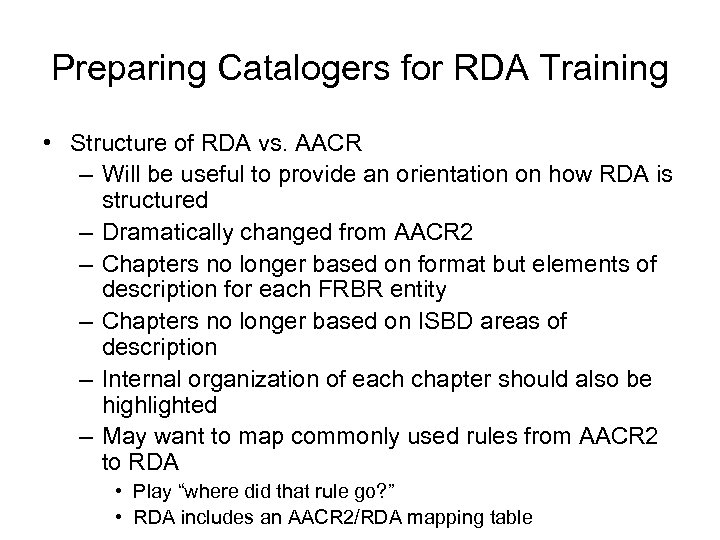 Preparing Catalogers for RDA Training • Structure of RDA vs. AACR – Will be useful to provide an orientation on how RDA is structured – Dramatically changed from AACR 2 – Chapters no longer based on format but elements of description for each FRBR entity – Chapters no longer based on ISBD areas of description – Internal organization of each chapter should also be highlighted – May want to map commonly used rules from AACR 2 to RDA • Play “where did that rule go? ” • RDA includes an AACR 2/RDA mapping table