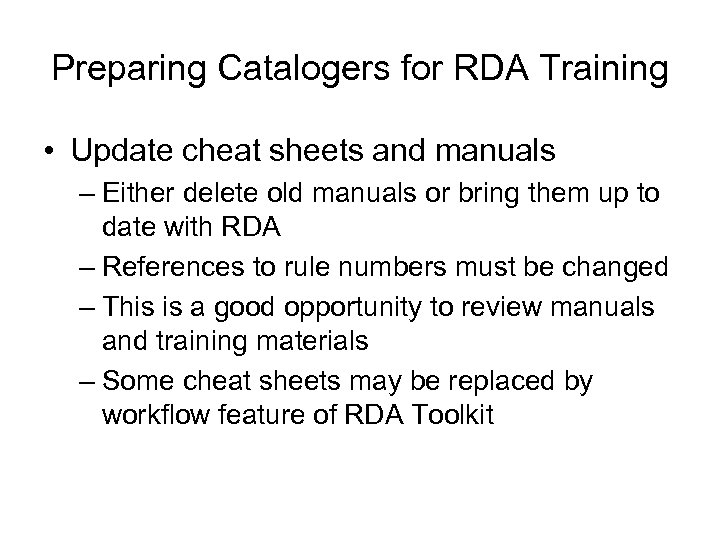 Preparing Catalogers for RDA Training • Update cheat sheets and manuals – Either delete old manuals or bring them up to date with RDA – References to rule numbers must be changed – This is a good opportunity to review manuals and training materials – Some cheat sheets may be replaced by workflow feature of RDA Toolkit