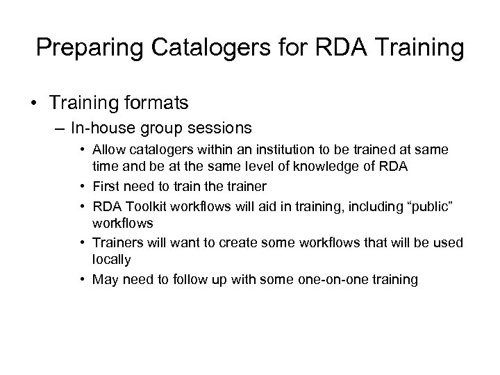 Preparing Catalogers for RDA Training • Training formats – In-house group sessions • Allow catalogers within an institution to be trained at same time and be at the same level of knowledge of RDA • First need to train the trainer • RDA Toolkit workflows will aid in training, including “public” workflows • Trainers will want to create some workflows that will be used locally • May need to follow up with some one-on-one training