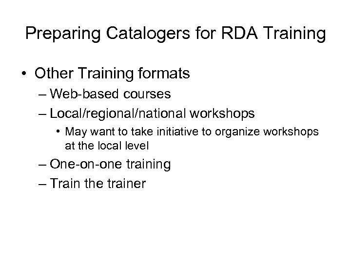 Preparing Catalogers for RDA Training • Other Training formats – Web-based courses – Local/regional/national workshops • May want to take initiative to organize workshops at the local level – One-on-one training – Train the trainer