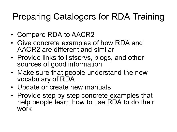 Preparing Catalogers for RDA Training • Compare RDA to AACR 2 • Give concrete examples of how RDA and AACR 2 are different and similar • Provide links to listservs, blogs, and other sources of good information • Make sure that people understand the new vocabulary of RDA • Update or create new manuals • Provide step by step concrete examples that help people learn how to use RDA to do their work