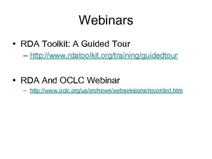 Webinars • RDA Toolkit: A Guided Tour – http: //www. rdatoolkit. org/training/guidedtour • RDA And OCLC Webinar – http: //www. oclc. org/us/en/news/websessions/recorded. htm